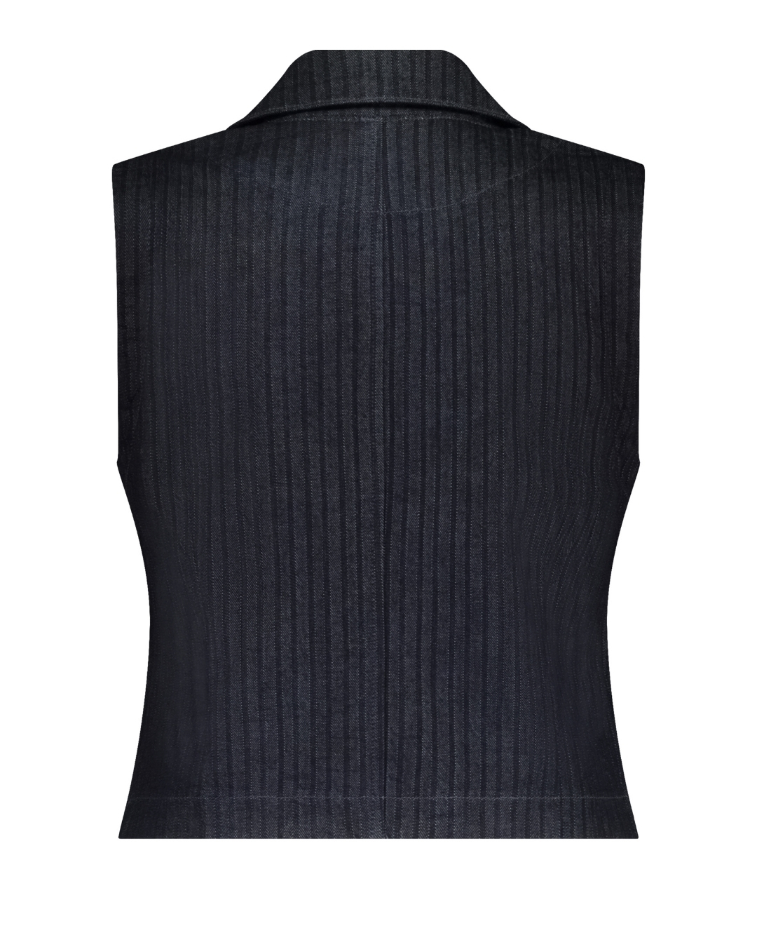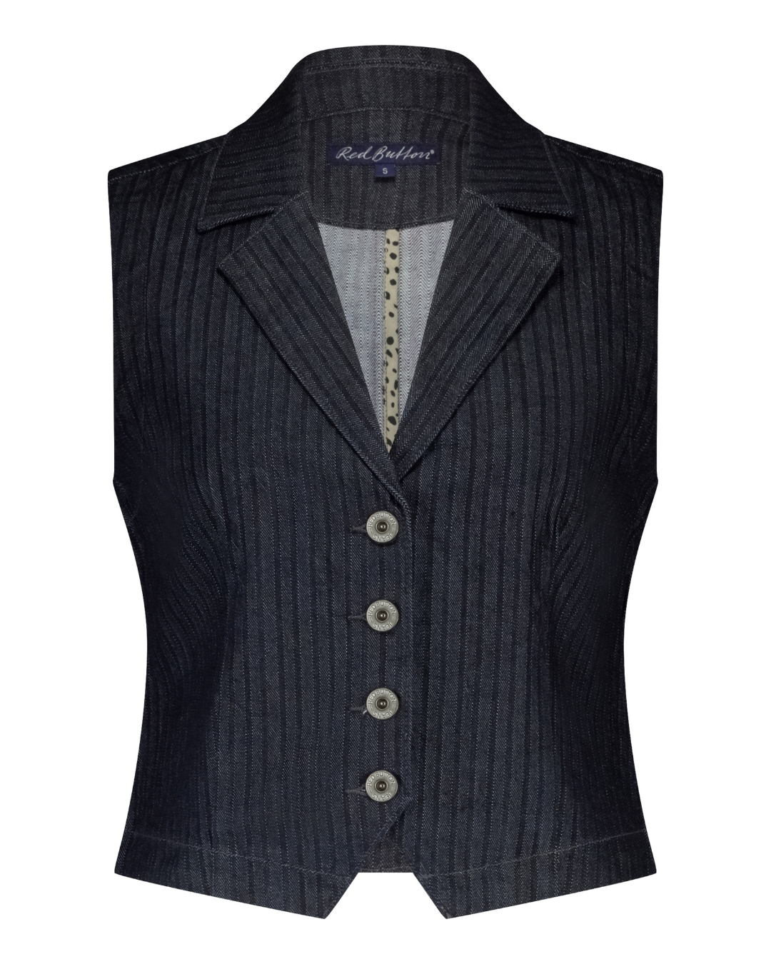De Waistcoat Blue Denim Stripe heeft een geweven streepmotief en een donkerblauwe wassing. De waistcoat heeft een knoopsluiting aan de voorkant, een reverskraag en is gemaakt van stretch denim voor ultiem comfort.