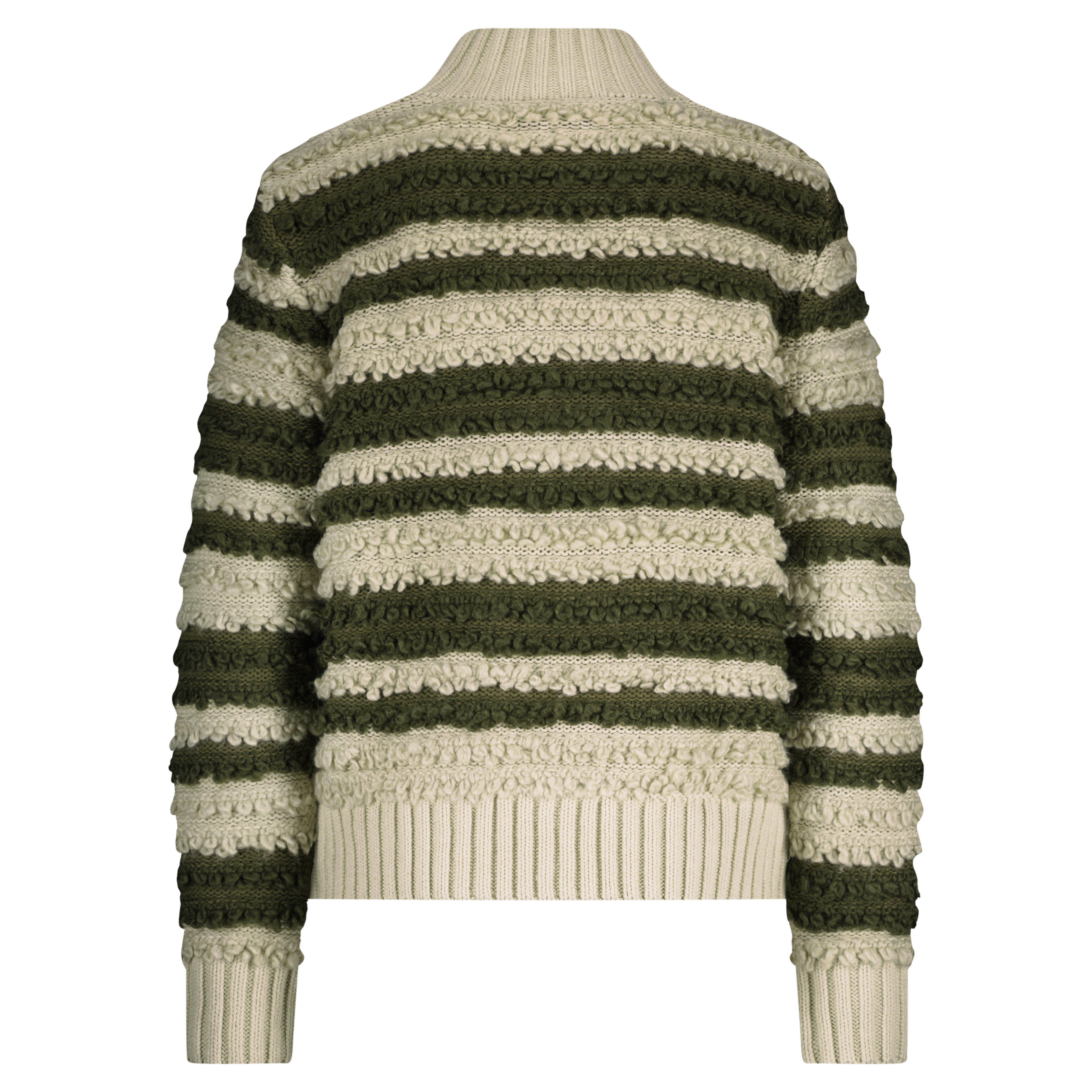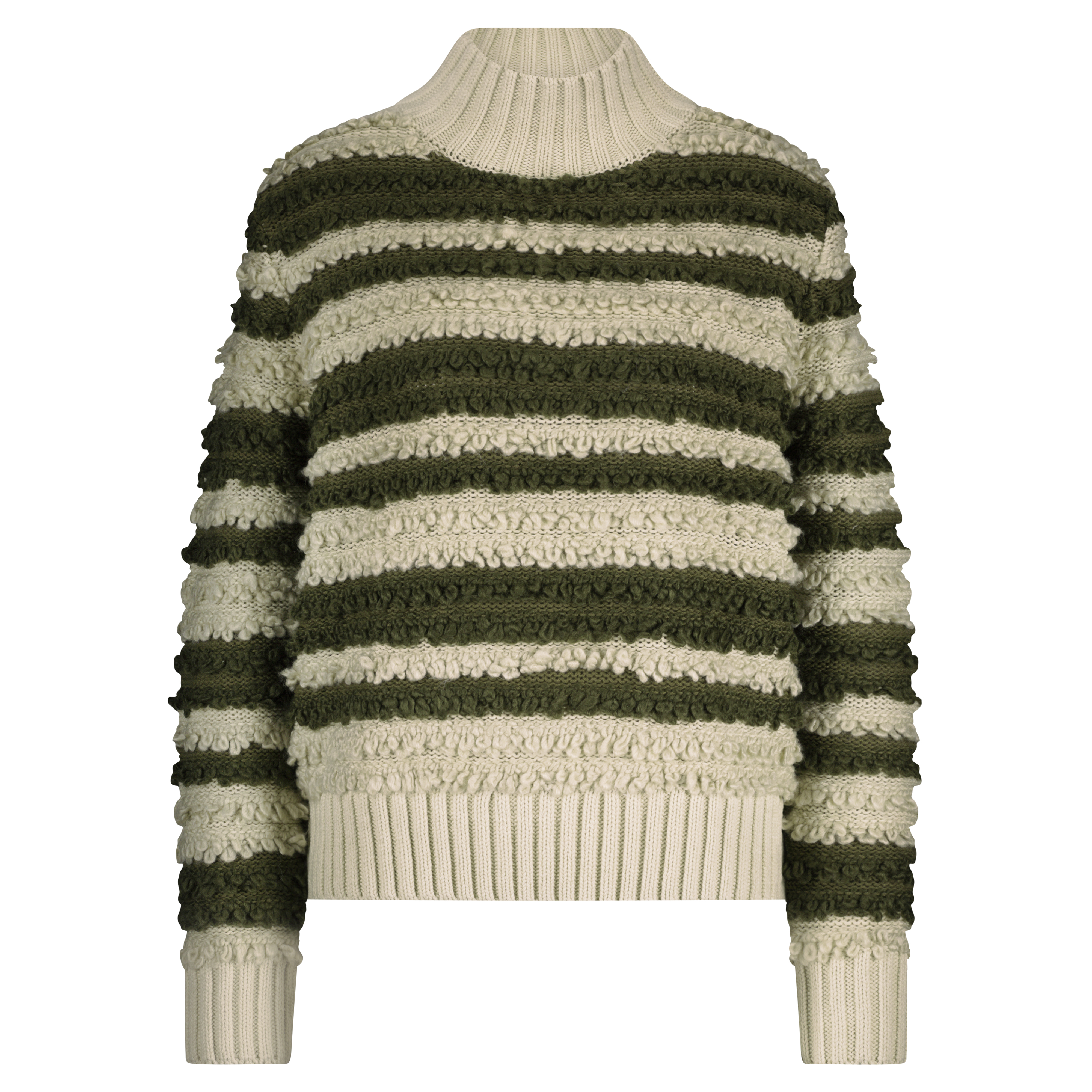 De Sweater with Loops + Stripe is een grof gebreide trui met lusjes. Deze trui heeft lange mouwen, een col en een geribde boord bij de mouwen, col en aan de onderkant. De Sweater with Loops + Stripe is verkrijgbaar in de kleuren brown & khaki.