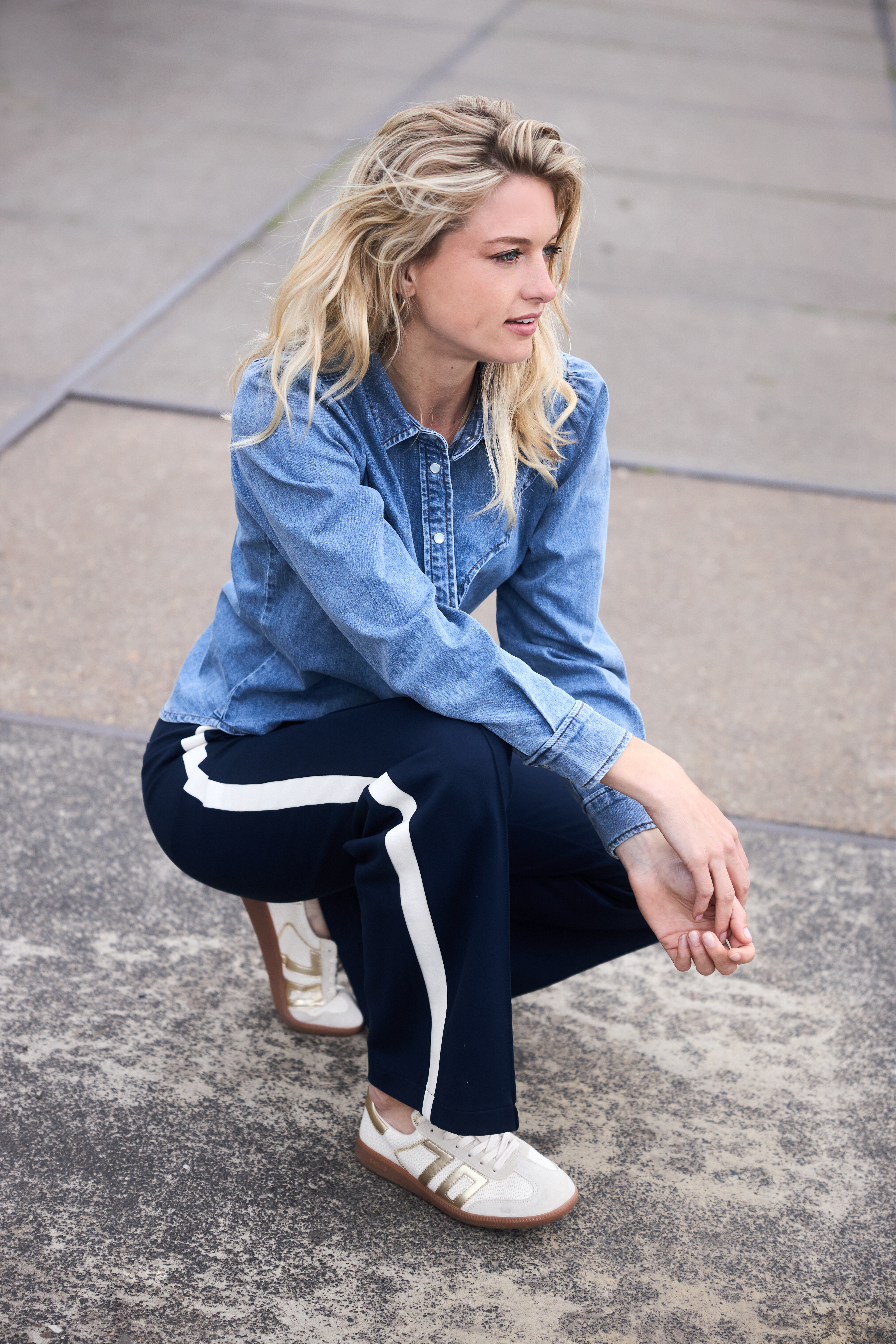 De Victoria Blouse Denim is een denim blouse met lange mouwen en een sluiting van drukknopen aan de voorkant. De blouse heeft kleine pofmouwen en een sierstiksel aan de voorkant.