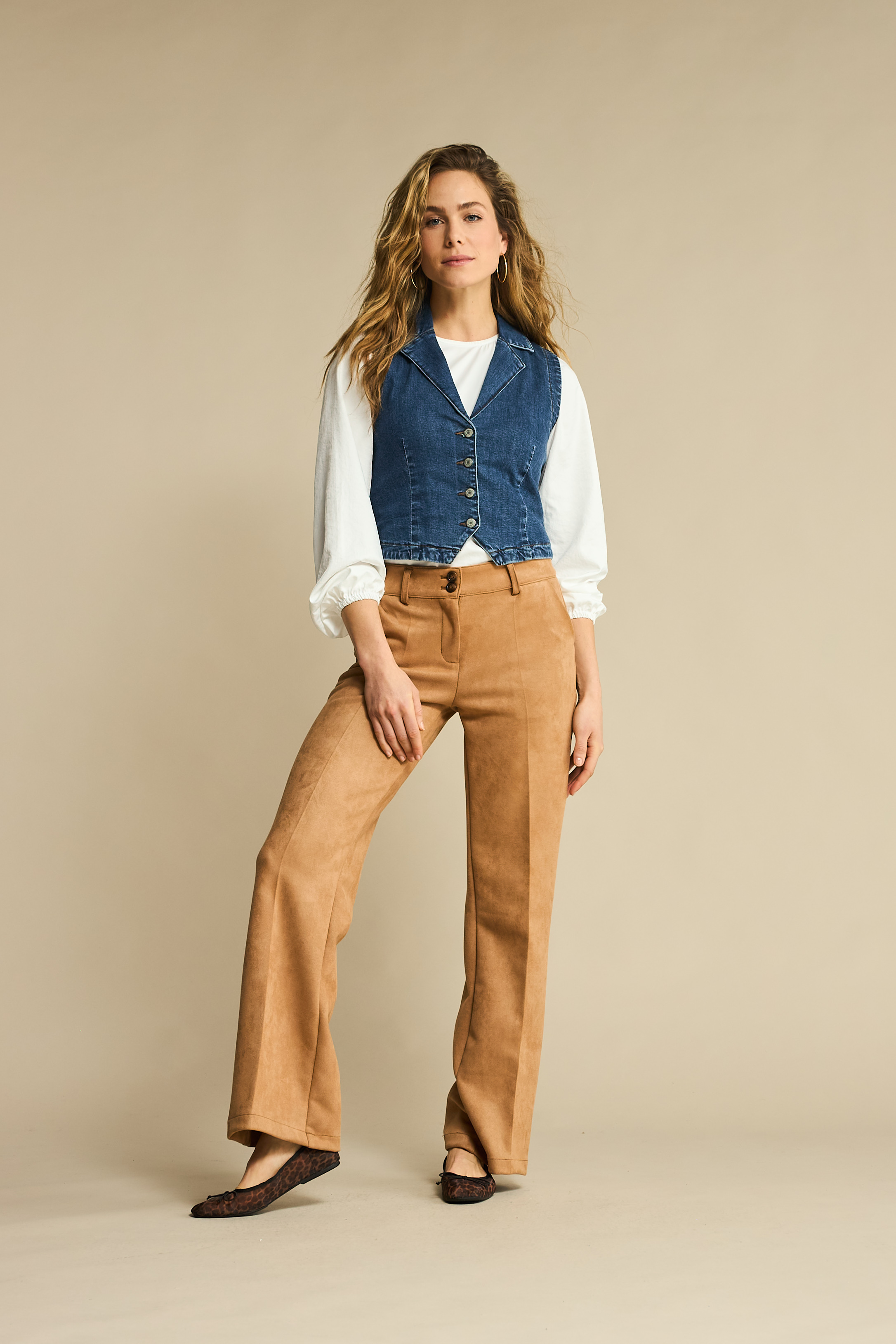 De Claudette Faux Suede is een wide leg broek met een dubbele knoopsluiting en een suede look. Deze broek is aansluitend op de heup en loopt vanaf de bovenbeen wijd uit. De Claudette Faux Suede heeft een comfortabele hoge taille, steekzakken en paspelzakken aan de achterkant. Deze broek kan gecombineerd worden met de bijpassende jas, de Jacket Faux Suede SRB4698, als set.
