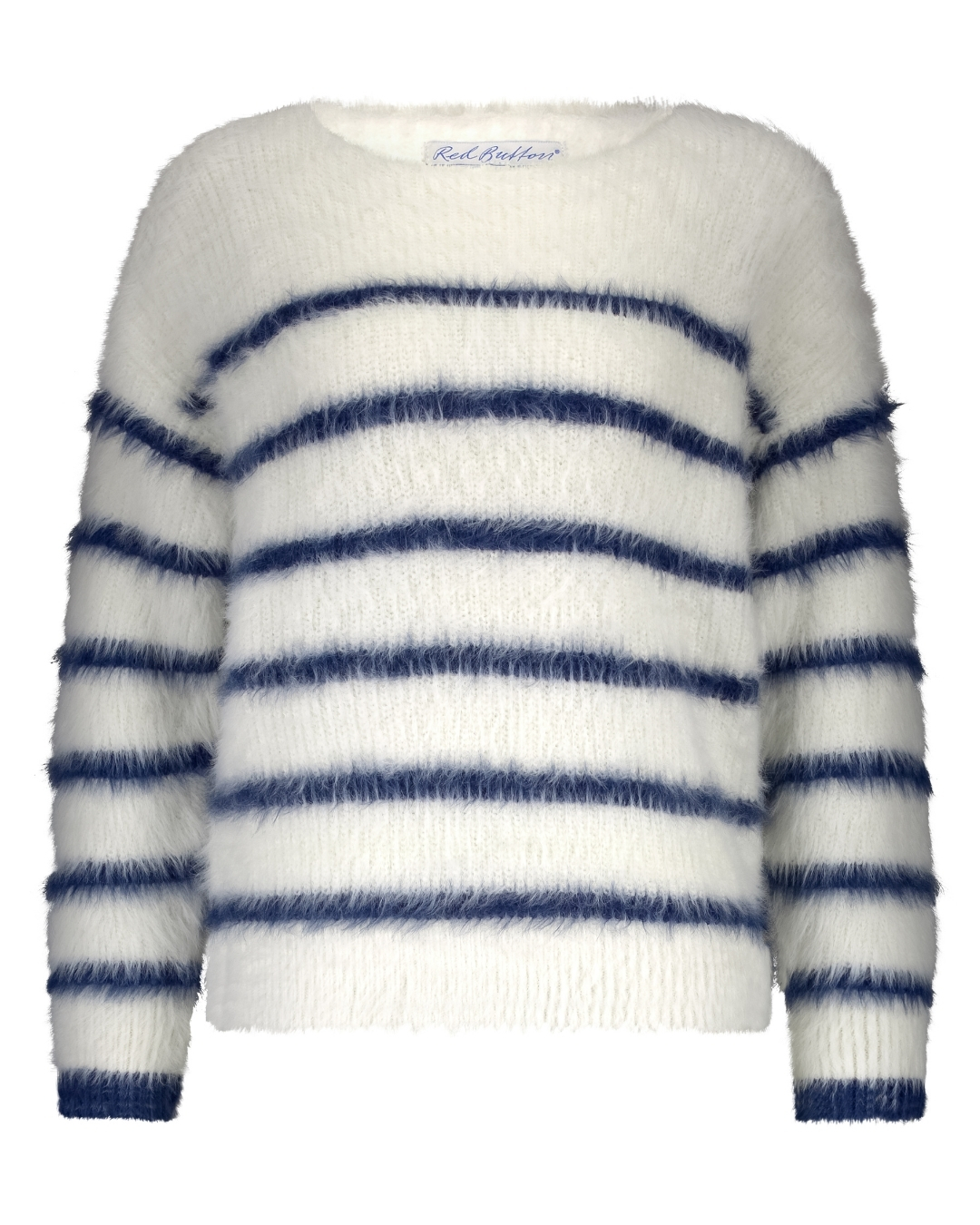 De Fuzzy Sweater & Stripe is een fluffy trui met lange mouwen en een ronde hals. De trui is gemaakt van een langharig zacht breisel en heeft een gestreept motief. De Fuzzy Sweater & Stripe is beschikbaar in de kleuren cream/ruby, ecru/indigo, ecru/pine & latte/black.