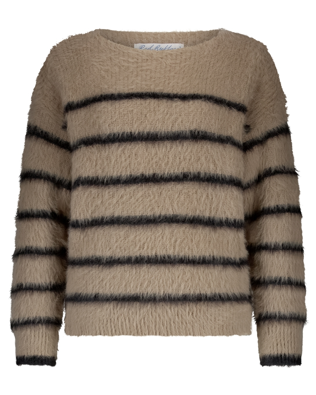 De Fuzzy Sweater & Stripe is een fluffy trui met lange mouwen en een ronde hals. De trui is gemaakt van een langharig zacht breisel en heeft een gestreept motief. De Fuzzy Sweater & Stripe is beschikbaar in de kleuren cream/ruby, ecru/indigo, ecru/pine & latte/black.