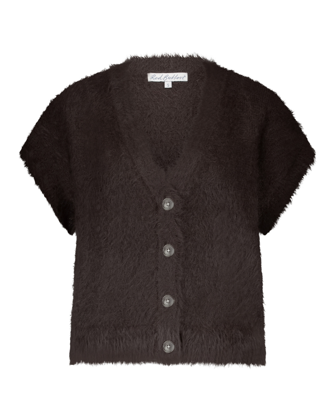 De Sleeveless Fuzzy is een vest gemaakt van een langharig zacht breisel. Het vest heeft korte mouwen, een V-hals en een knoopsluiting aan de voorkant. De Sleeveless Fuzzy is verkrijgbaar in de kleuren almond, lava, espresso, black, olive, ruby & pine.